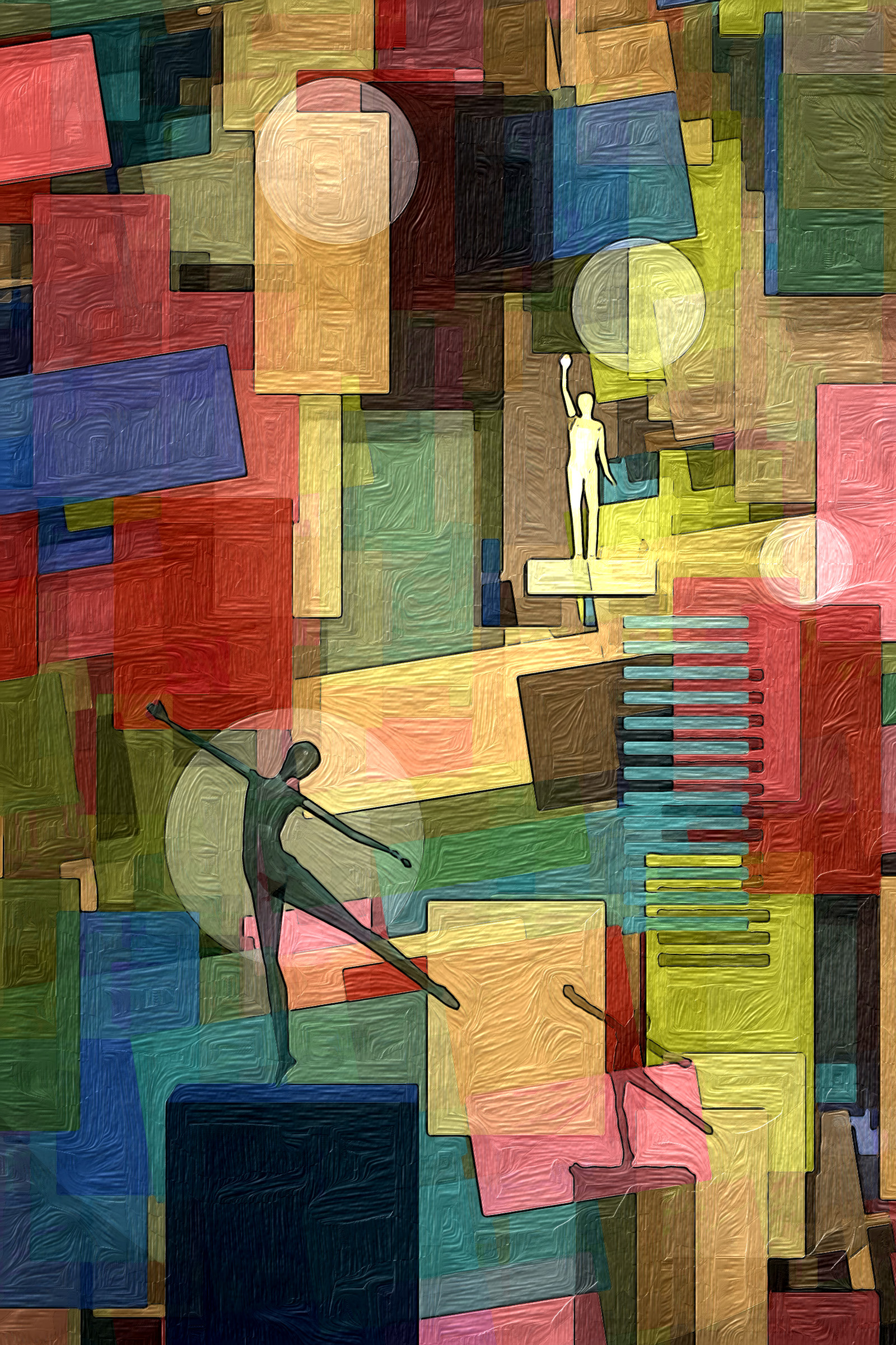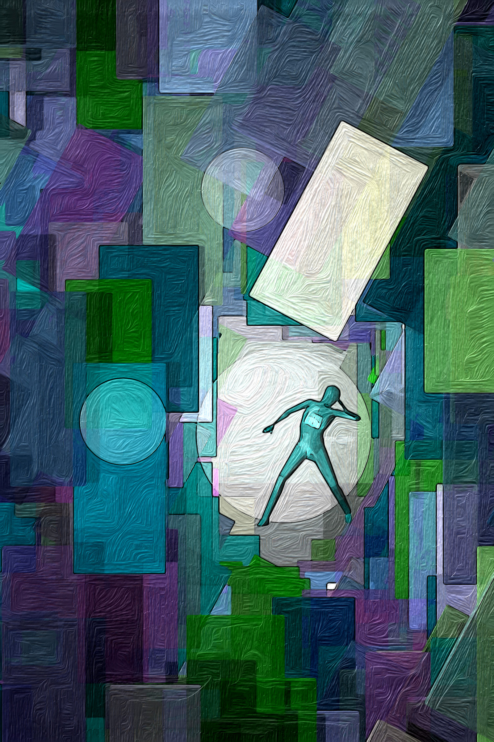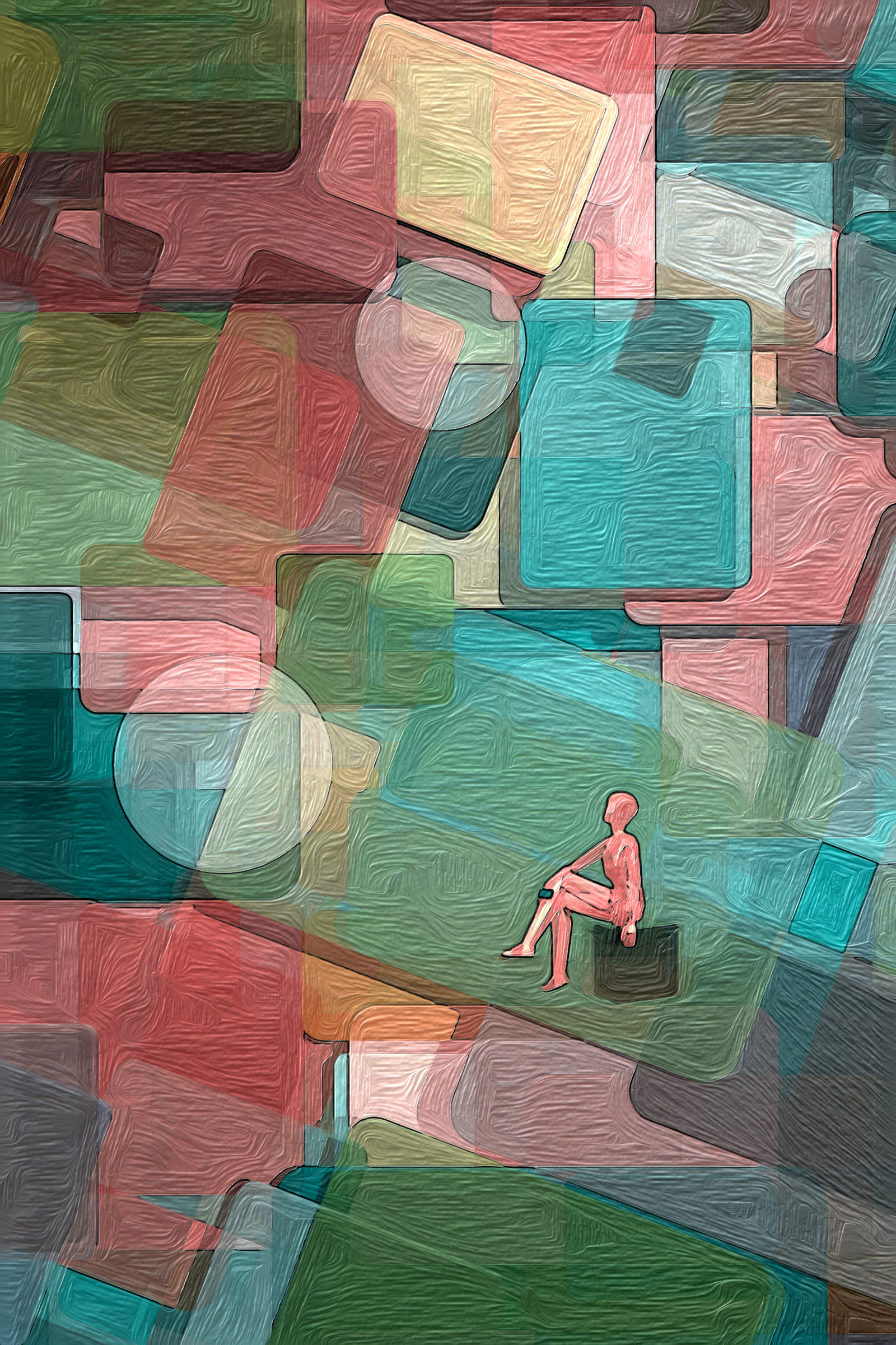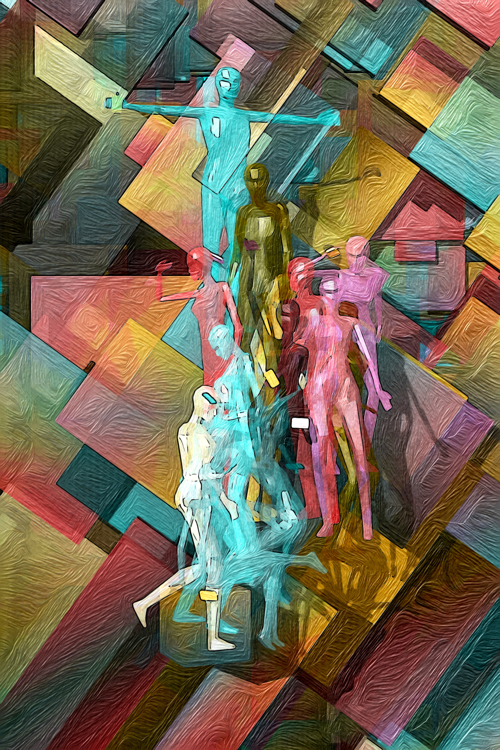 The pieces combine geometric and human forms as a commentary on the ways we shape, and are shaped by, online spaces.