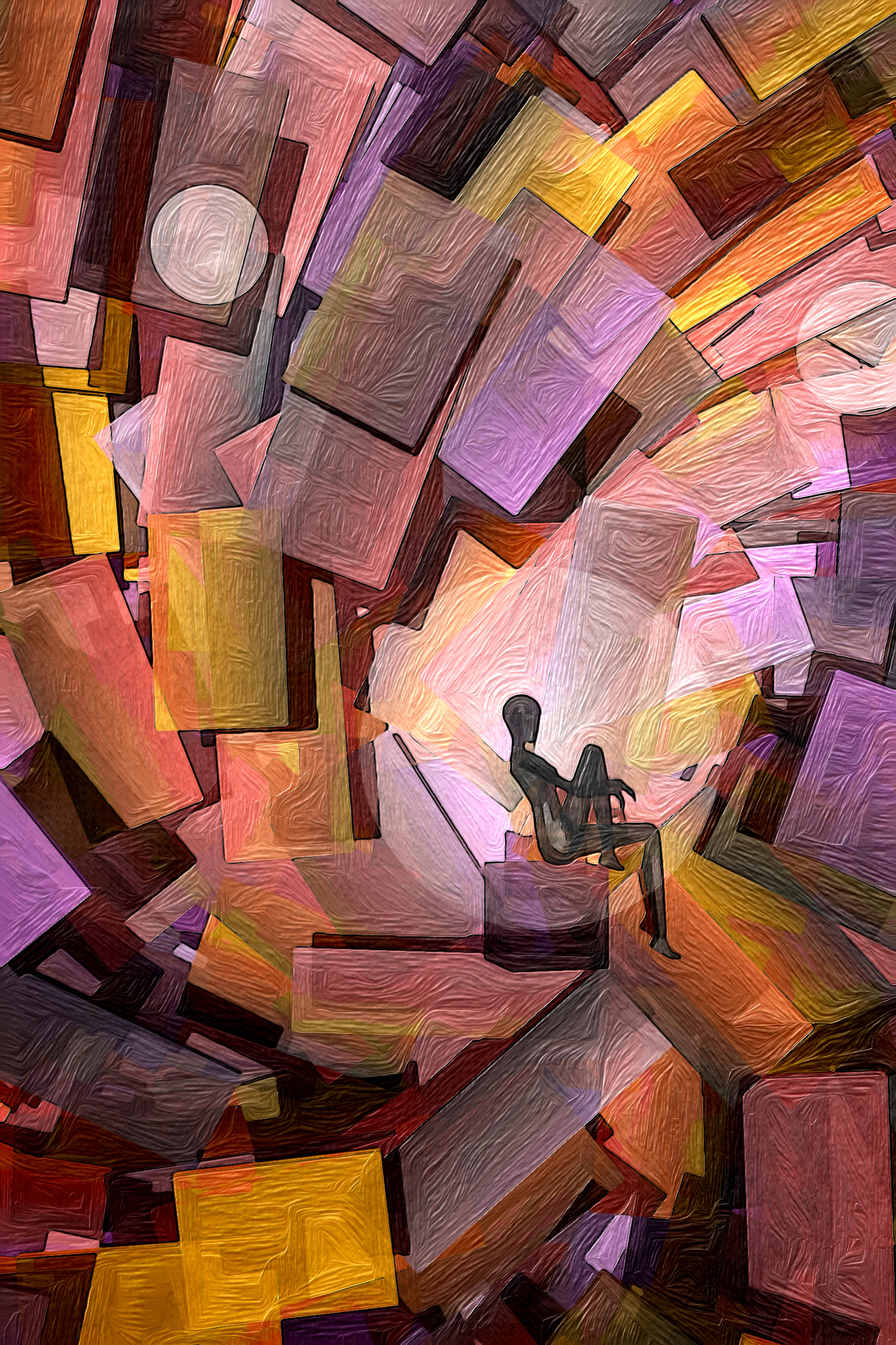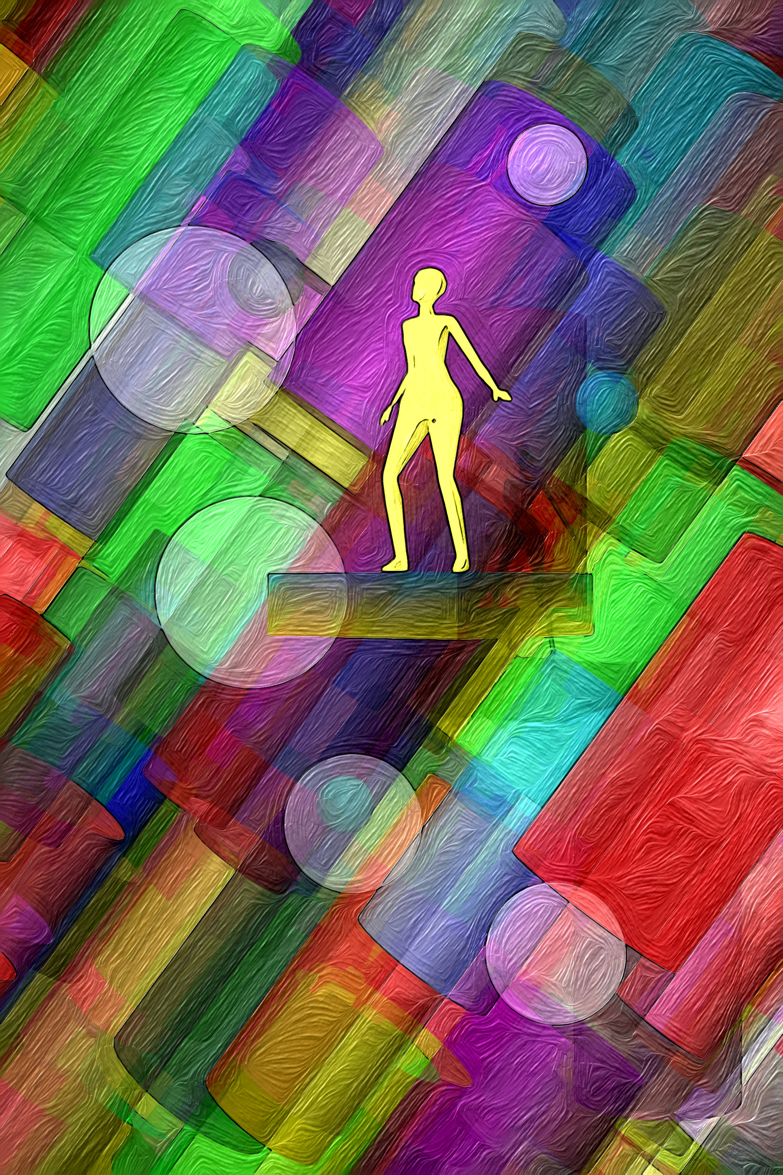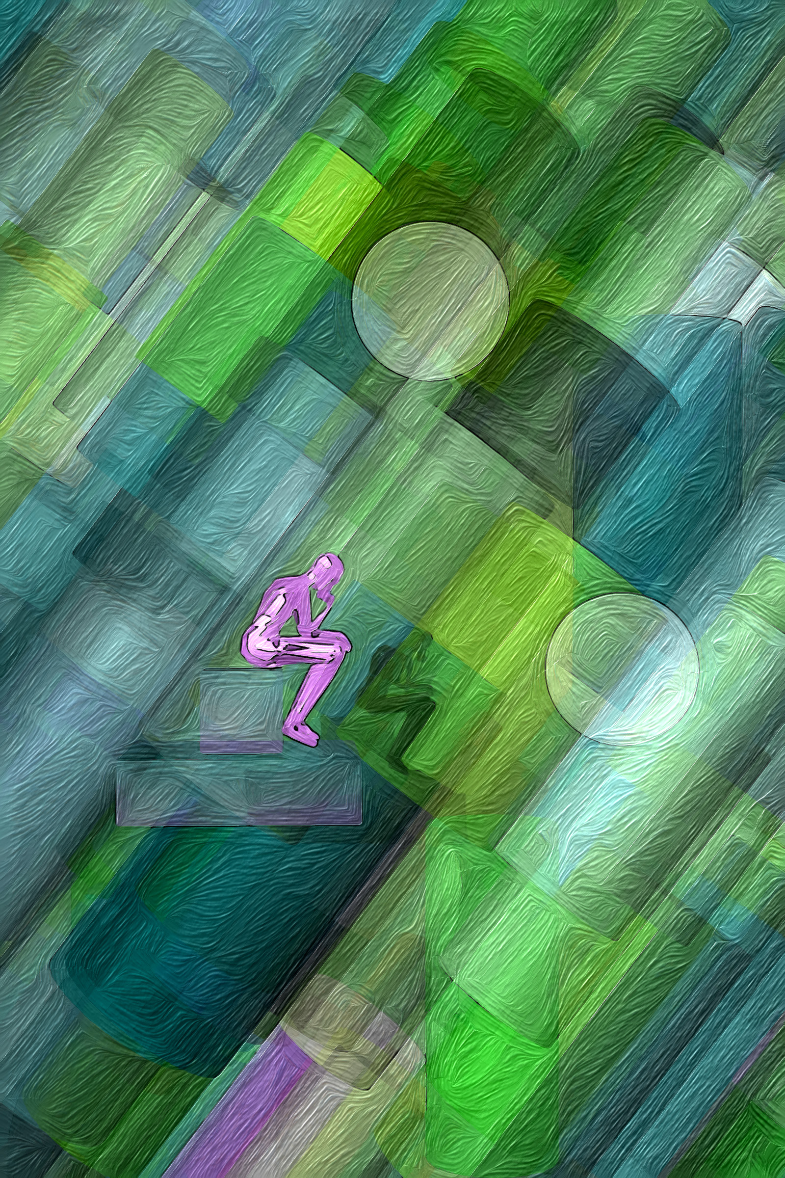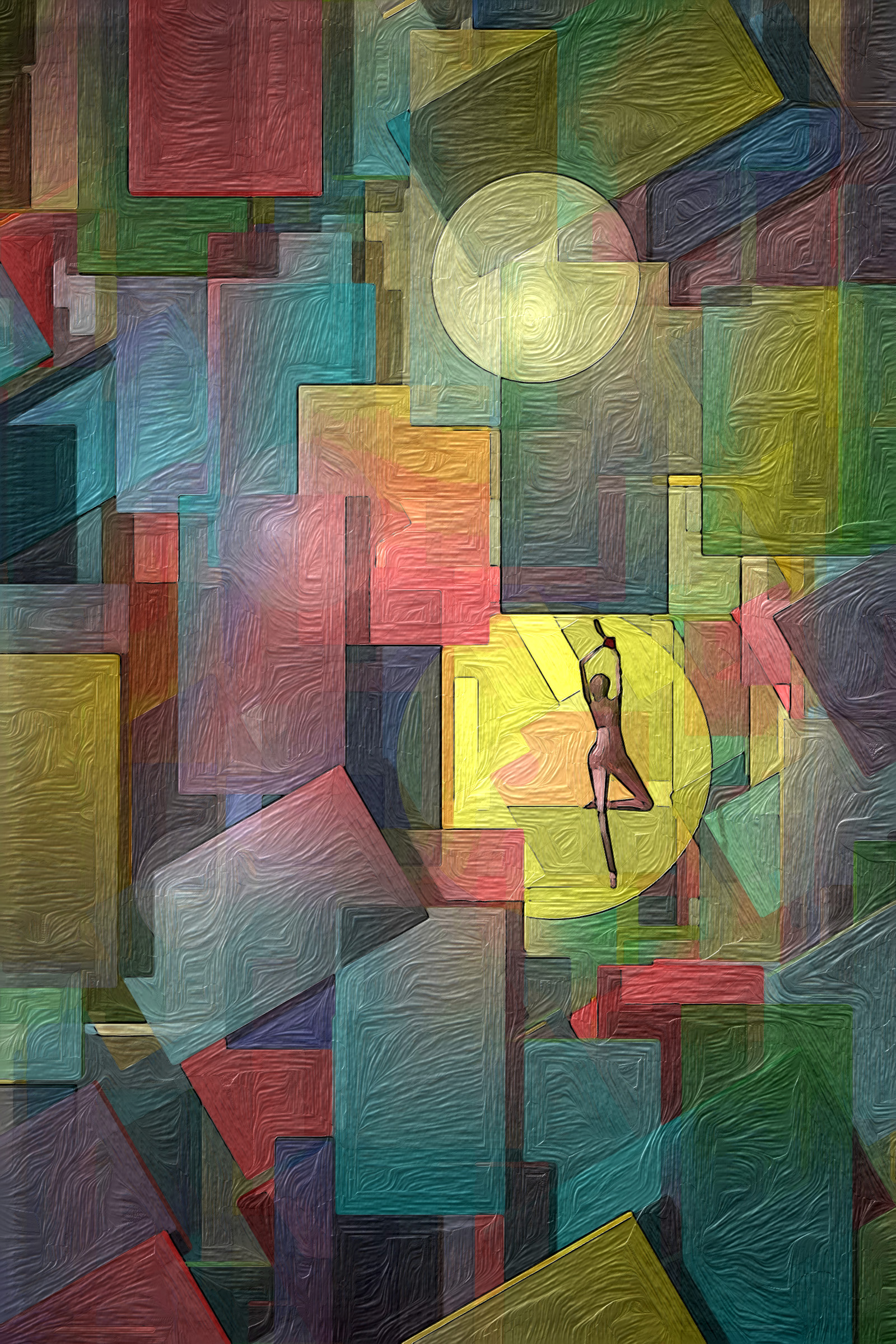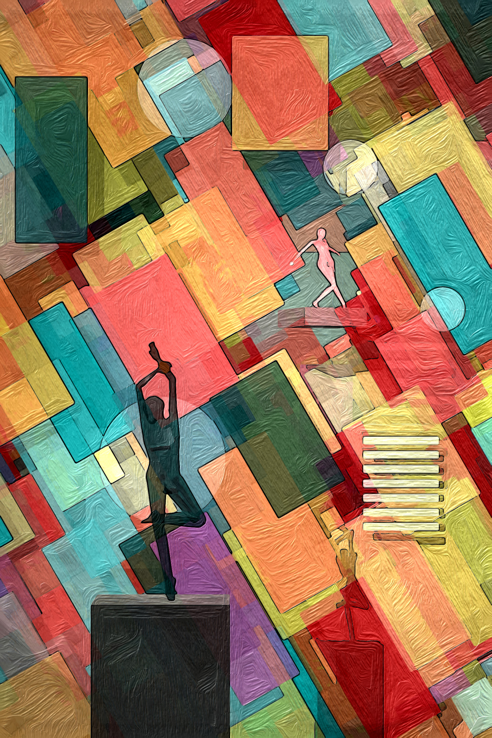 The pieces combine geometric and human forms as a commentary on the ways we shape, and are shaped by, online spaces.